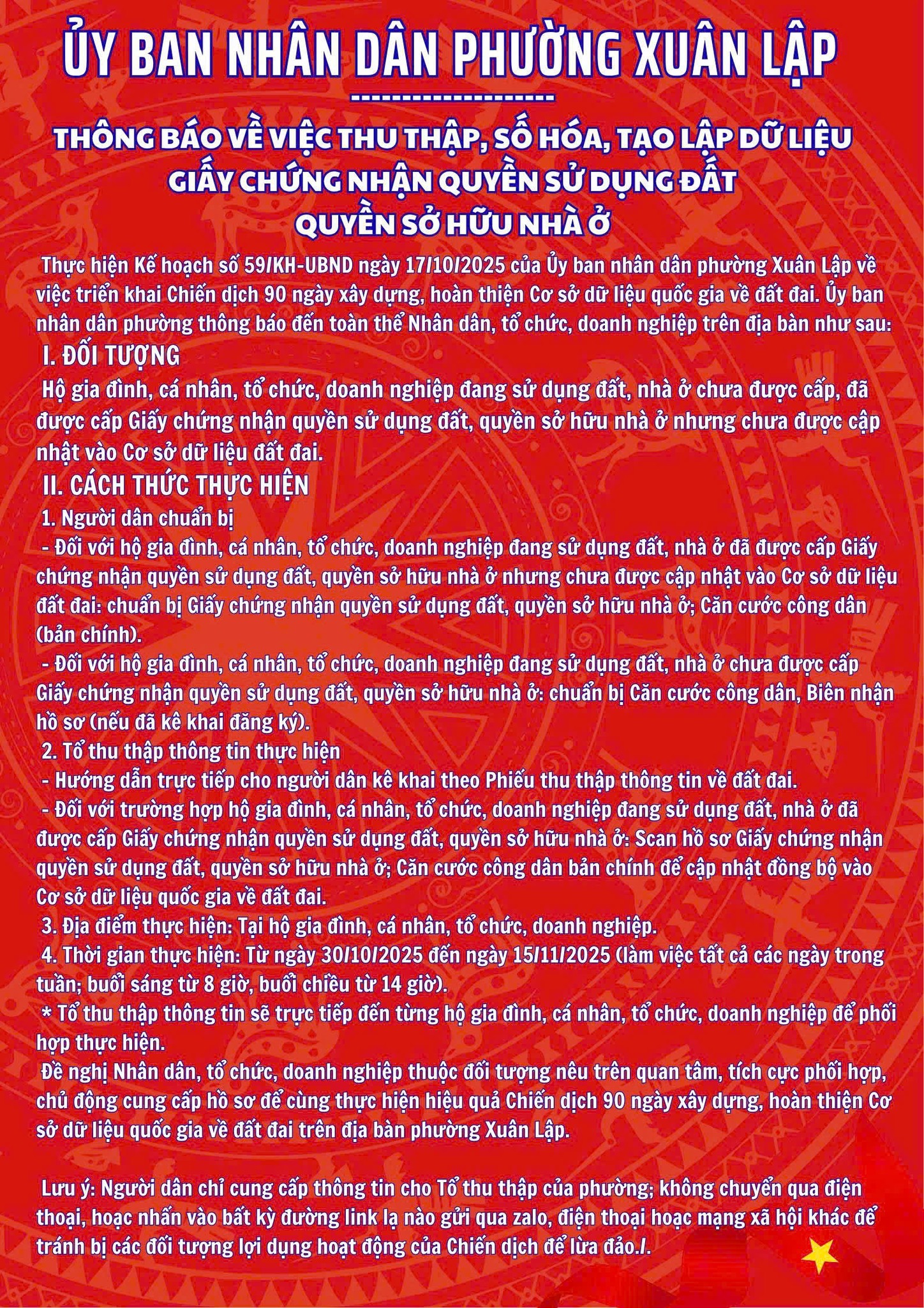Ủy ban Nhân dân phường Xuân Lập Thông báo về việc thu thập, số hóa, tạo lập dữ liệu Giấy chứng nhận quyền sử dụng đất, Quyền sở hữu nhà ở.